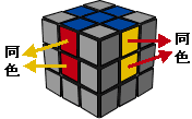 你有1/6的概率已经完成。如果不是,就首先找一条边,这条边的两个角有相同的颜色(概率2/3)。两角中间的棱颜色和下面两层的颜色我们不用关心。现在把这条边放在背面,